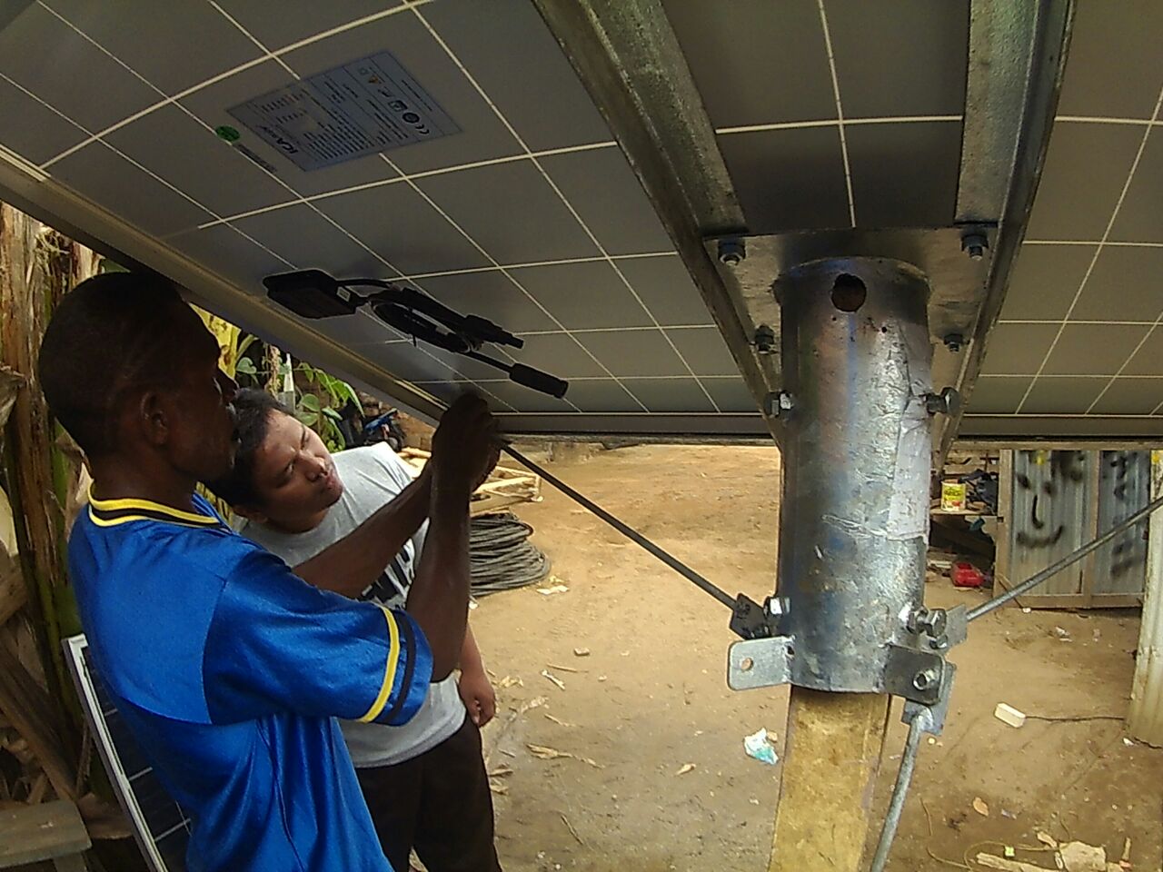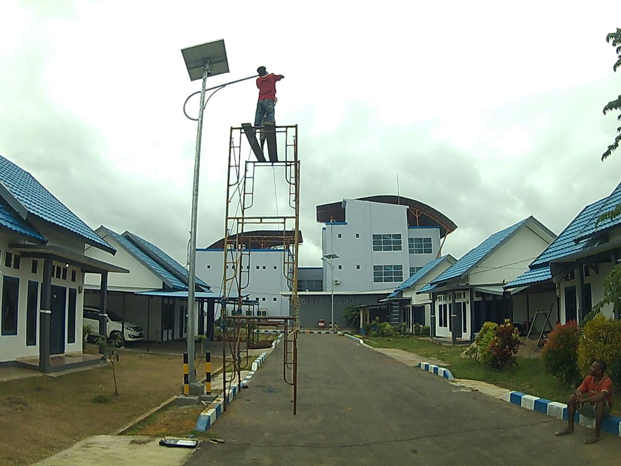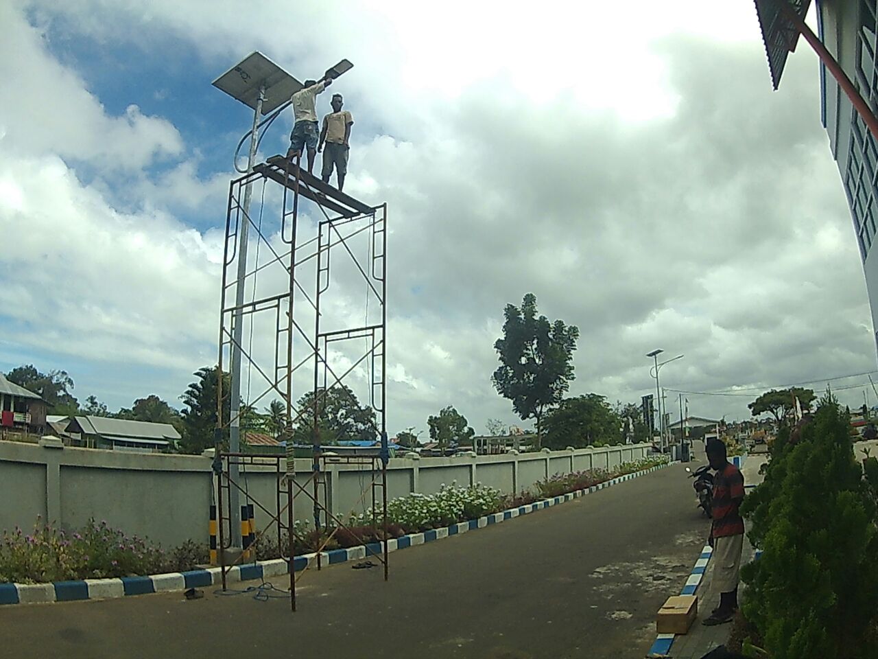 Proses pengerjaan pemasangan tiang penyanggah untuk panel surya di Bandara Merauke Papua. Recanannya panel solar ini difungsikan sebagai lampu penerangan jalan dan diharapkan jalan disekitar Bandara Merauke mendapatkan penerangan yang baik pada waktu malam hari.